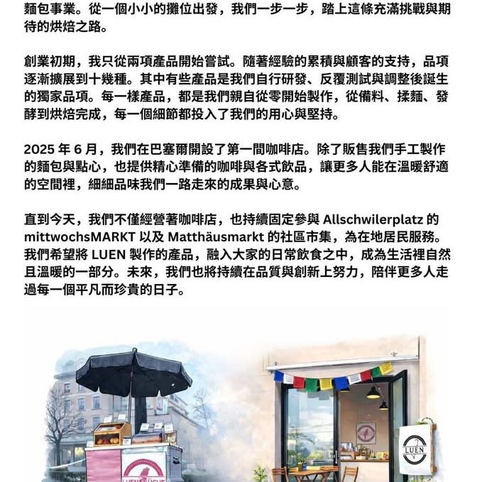 LUN is a Basel-based bakery that blends Taiwanese flavors with European baking craftsmanship. Founded in 2020 at the Matthäusmarkt, what began as a small market stand has grown into a well-loved local brand.